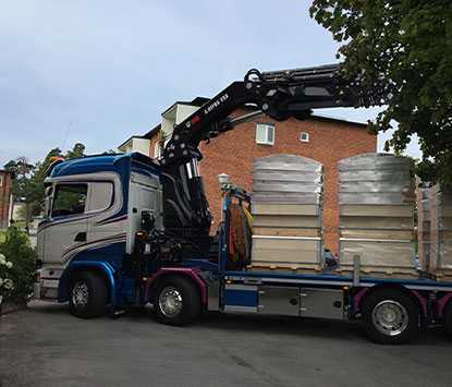 Kranbilen har en jibb vilket möjliggör olika lyftvinklar. Genom att vika in den yttersta delen av kranarmen över taket hamnar luckan rätt och kan enkelt sänkas ned på plats.